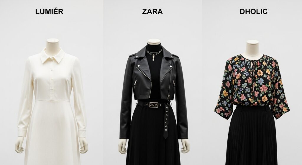 トレンドの最先端を積極的に取り入れたいならZARA、韓国系のフェミニンなスタイルが好きならDHOLIC、そして、長く使える上品でベーシックなアイテムを求めているならリュミエ、というように、それぞれのブランドに得意な領域があります。