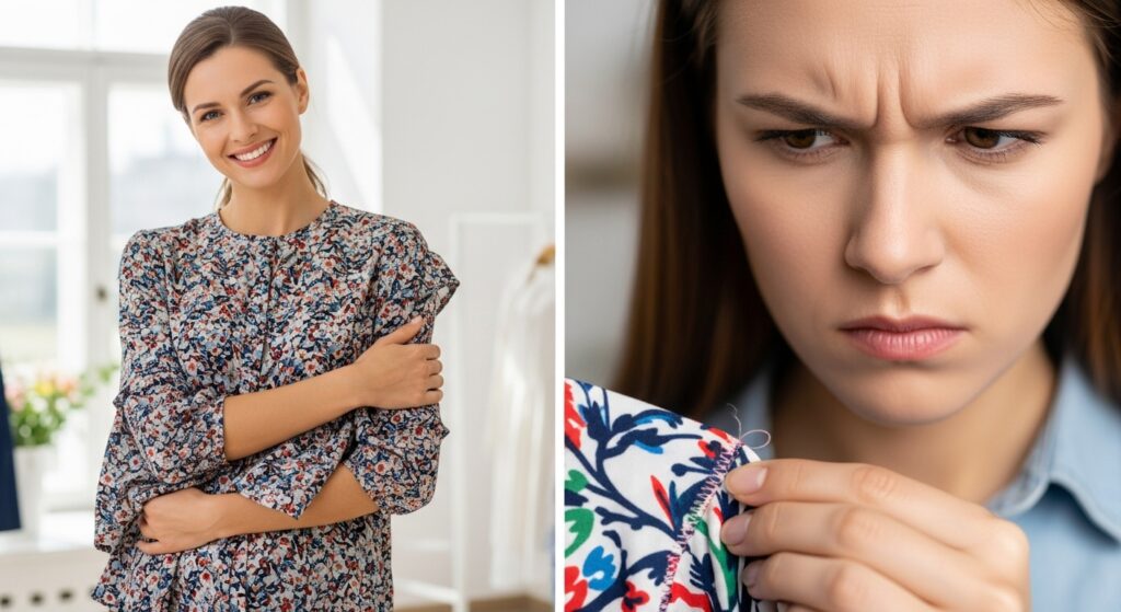 ポリエステルやレーヨンが多く含まれている服は、シワになりにくく、生地に「とろみ」や「落ち感」が生まれます。これにより、身体のラインを拾いすぎず、美しいドレープが生まれるため、エレガントで高見えする印象を与えます。リュミエのブラウスやワンピースに、この種の素材が多く使われています。