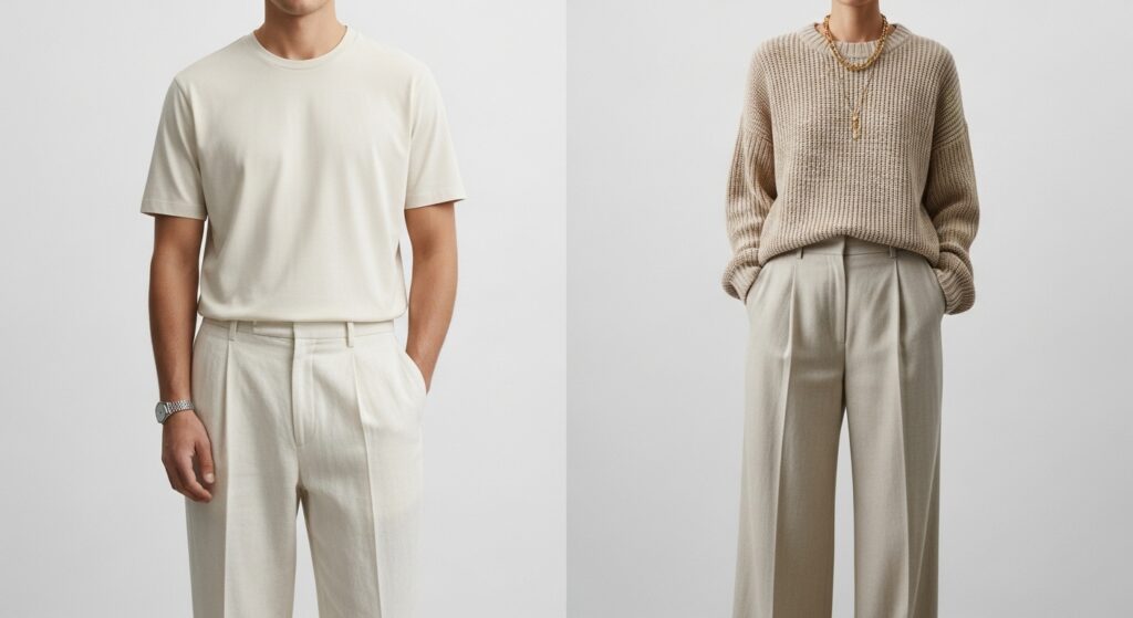 - ウェーブタイプの方: ソフトな素材のニットや、身体のラインに沿うような細身のパンツなどが、華奢な体型をスタイリッシュに見せます。