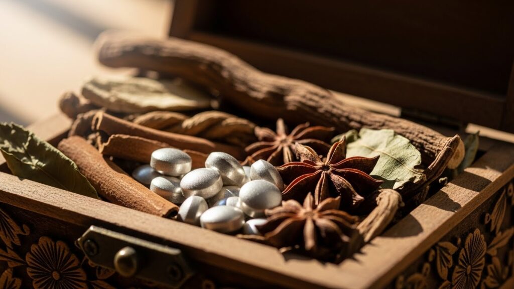 では、具体的にどのような成分がこの効果を生み出しているのでしょうか? 透頂香の正確な処方は一子相伝の秘伝ですが、一般的に漢方薬の観点から推察される成分(阿仙薬、桂皮、甘草など)とそのメカニズムを解説します。